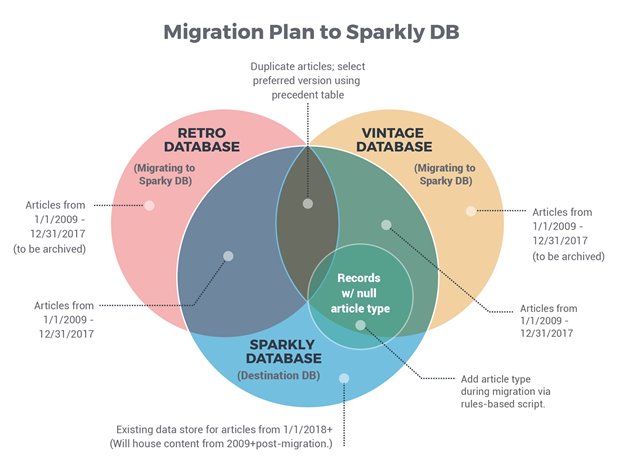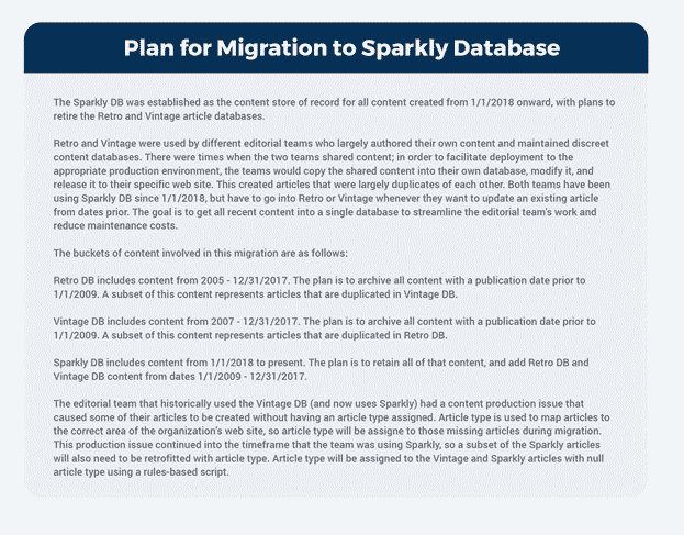 Content engineers should be very with comfortable whiteboarding and diagramming. An effective picture can reduce a conversation from hours to minutes and can quickly create alignment across multiple functions.For example a written out migration plan: